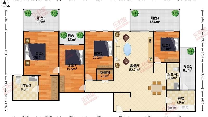 建面:201平方,4房
