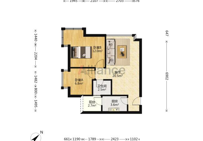 建面:61平方,二房一厅一卫