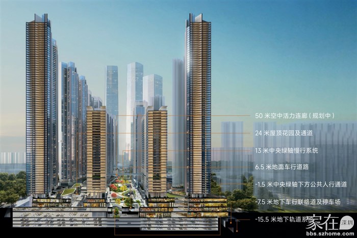绿景白石洲还借助中央绿轴+立体空间的设计手法,绿景白石洲将塑造一个无边界城市,能实现地下、地面、空中的三维立体转换以及多种生活场景的无缝切换。