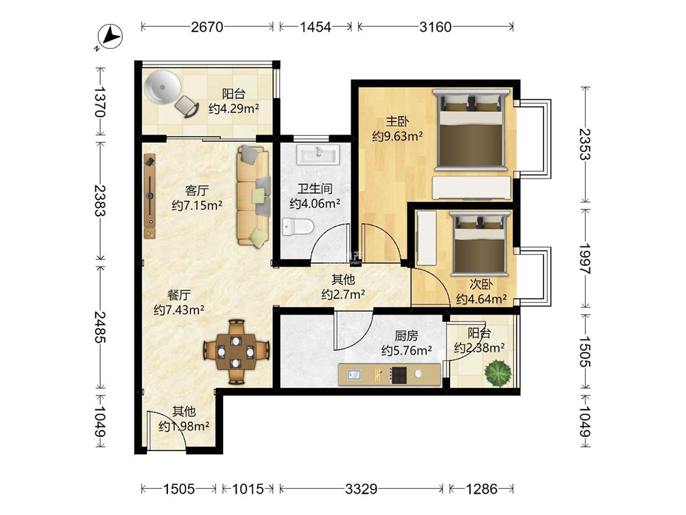 ②、【装修配套】:此房精装修,面积是63平方两房两厅,易出租,客厅朝南带一个户型大阳台,阳光明媚。