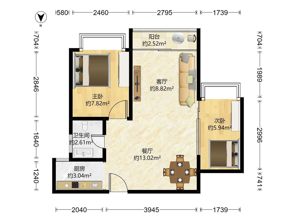 《户型介绍》:2房2厅1卫。带观景大阳台,厨卫全明户型