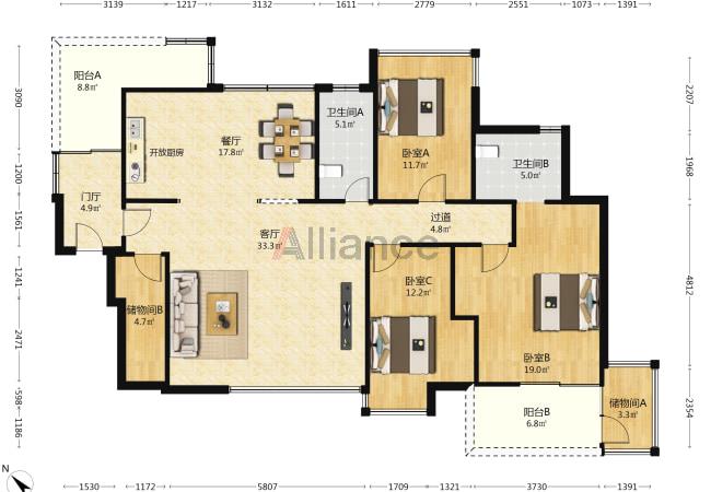 面积:147.86平方(3+1)房