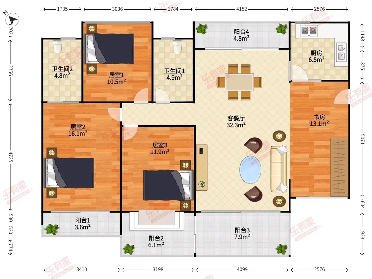 4.房子在小区中心,客厅出阳台精装大4房,适合一家人居住,全新精装修是可以拎包入住