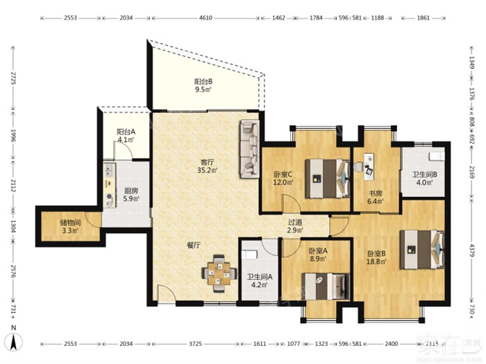 【中介】后海!蔚蓝海岸二期!138平!四房!保养不错!招租!14500月!已空出!