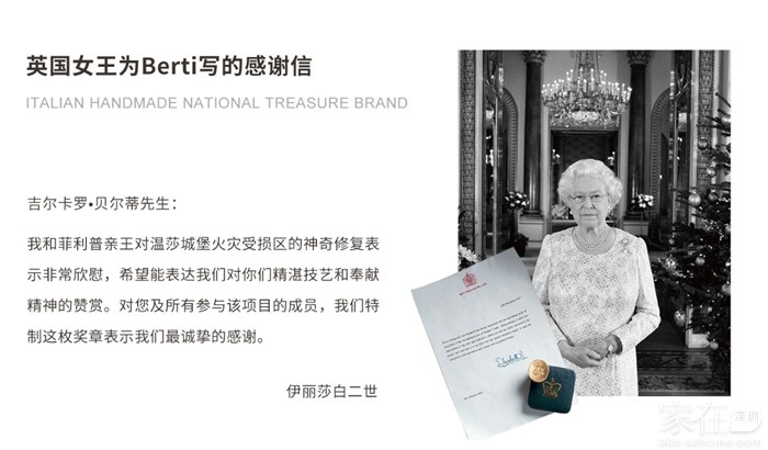 意大利Berti自带皇室贵族血统,因修复完全毁于大火的温莎城堡,获得英国伊丽莎白女王亲笔感谢信。