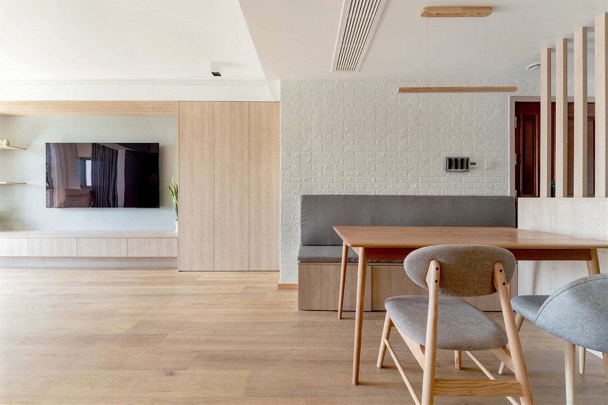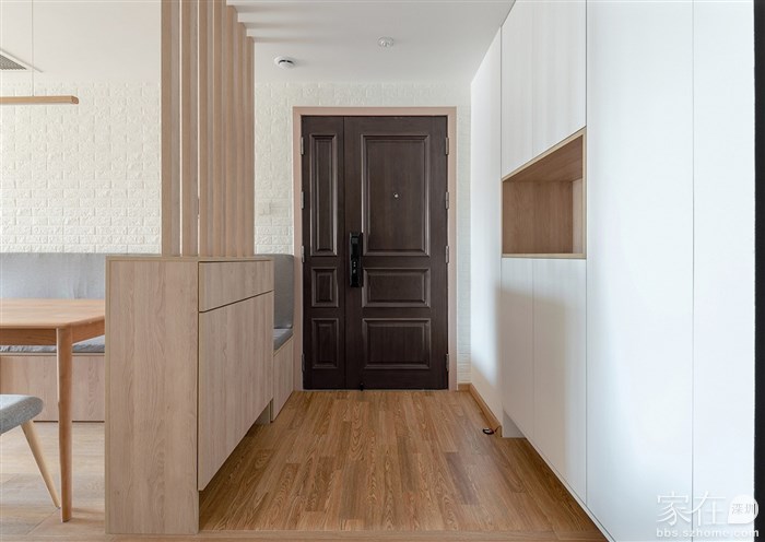 屏风,鞋柜,卡座之间的相互结合。 鞋柜没有顶到墙面,预留出卡座的位置,让卡座和鞋柜的侧面完整齐平。这样的细节是为了,让外露这部分,可以当作换鞋凳使用。 屏风是挨着过道一侧,另一边的柜子台面充当配餐台,临时放一些餐厅用的瓶瓶罐罐。