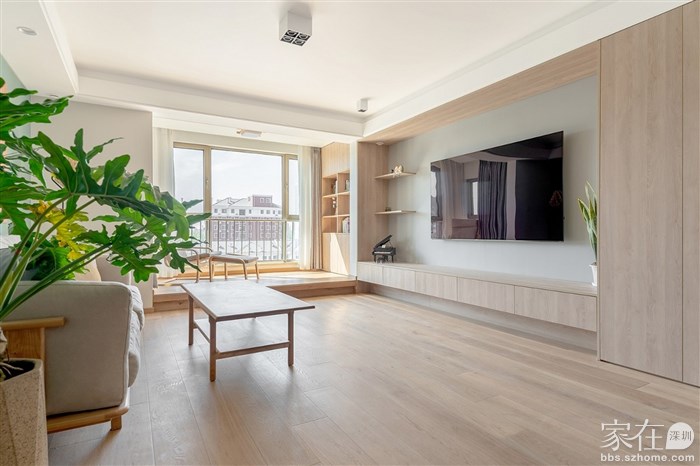 电视柜采用了定制的形式,这样和边上的落地收纳柜正好成为一个整体。中间部分没有落地,做了悬挂处理,下面加了灯带,光线暗的时候,打开既是辅助光源也使电视柜没有那么笨重。
