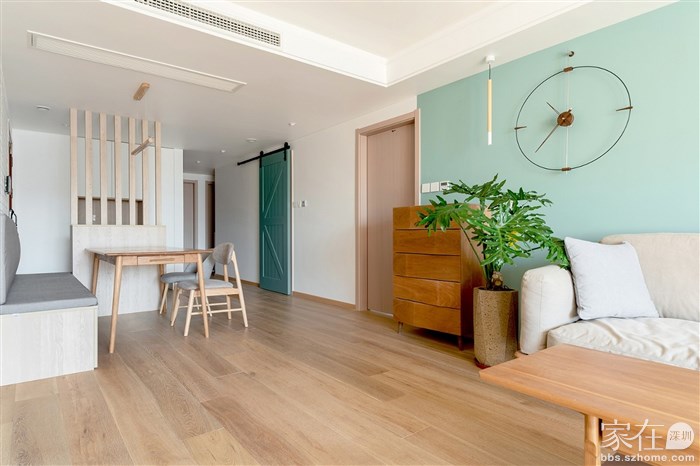 沙发边上放置的是一个五斗柜,对于家里的一些小件物品收纳能力还是很高的,加上边上的绿植和墙面的挂钟,这里就是家里的一个“小景点”,定期柜子上也会放置不同的装饰品。