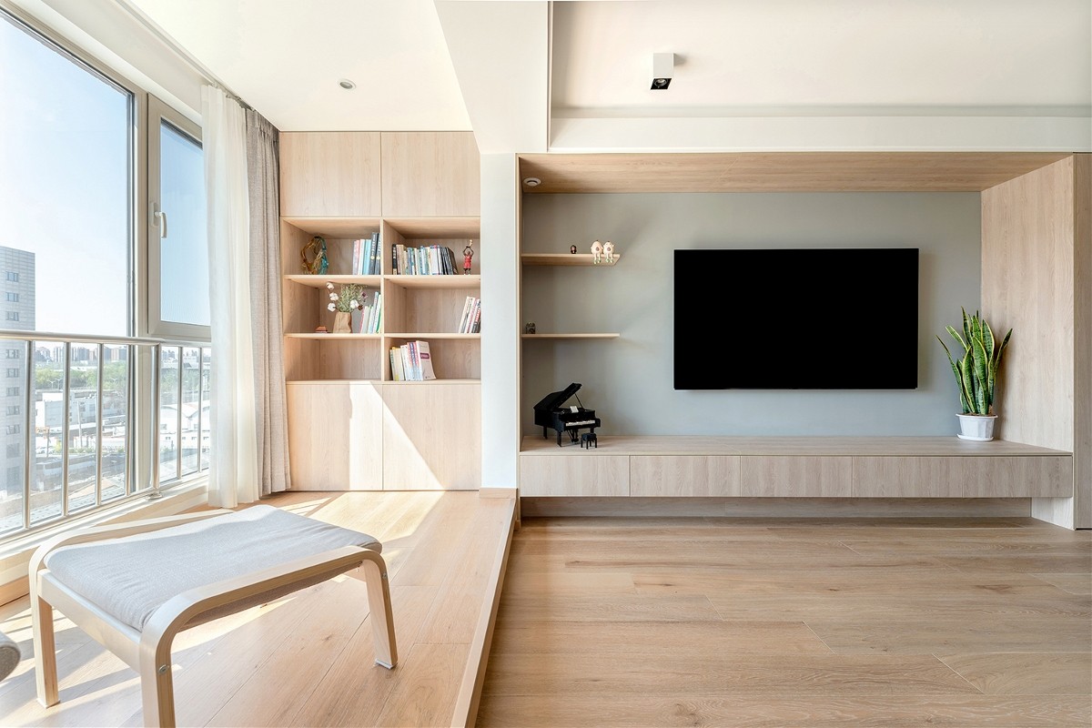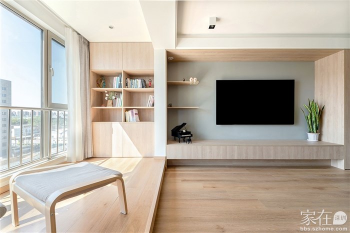 阳台的位置设计了地台,让这个空间平常可以作为阅读区,孩子玩耍的时候,也可以作为她们的玩具堆放区。加高的地台不会像直接接触地面那么凉,也不用担心孩子席地而坐。