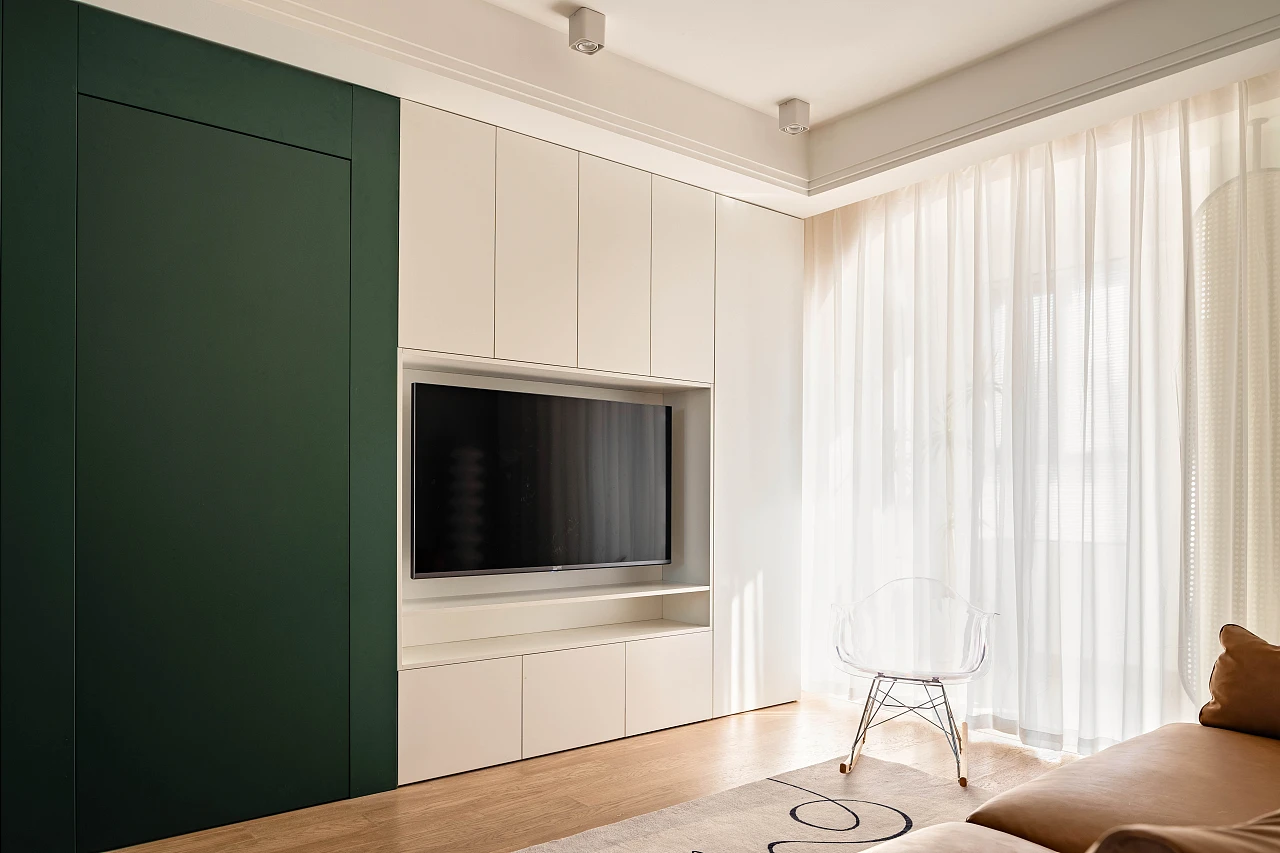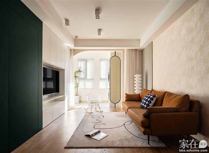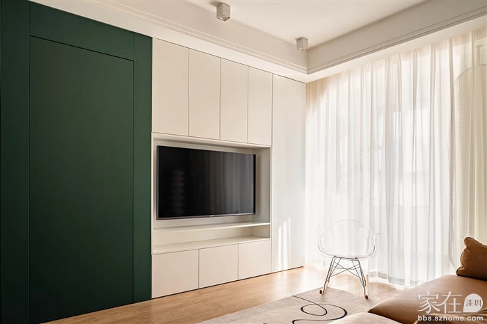 ▲入门鞋柜,次卧门及电视柜的一体化设计