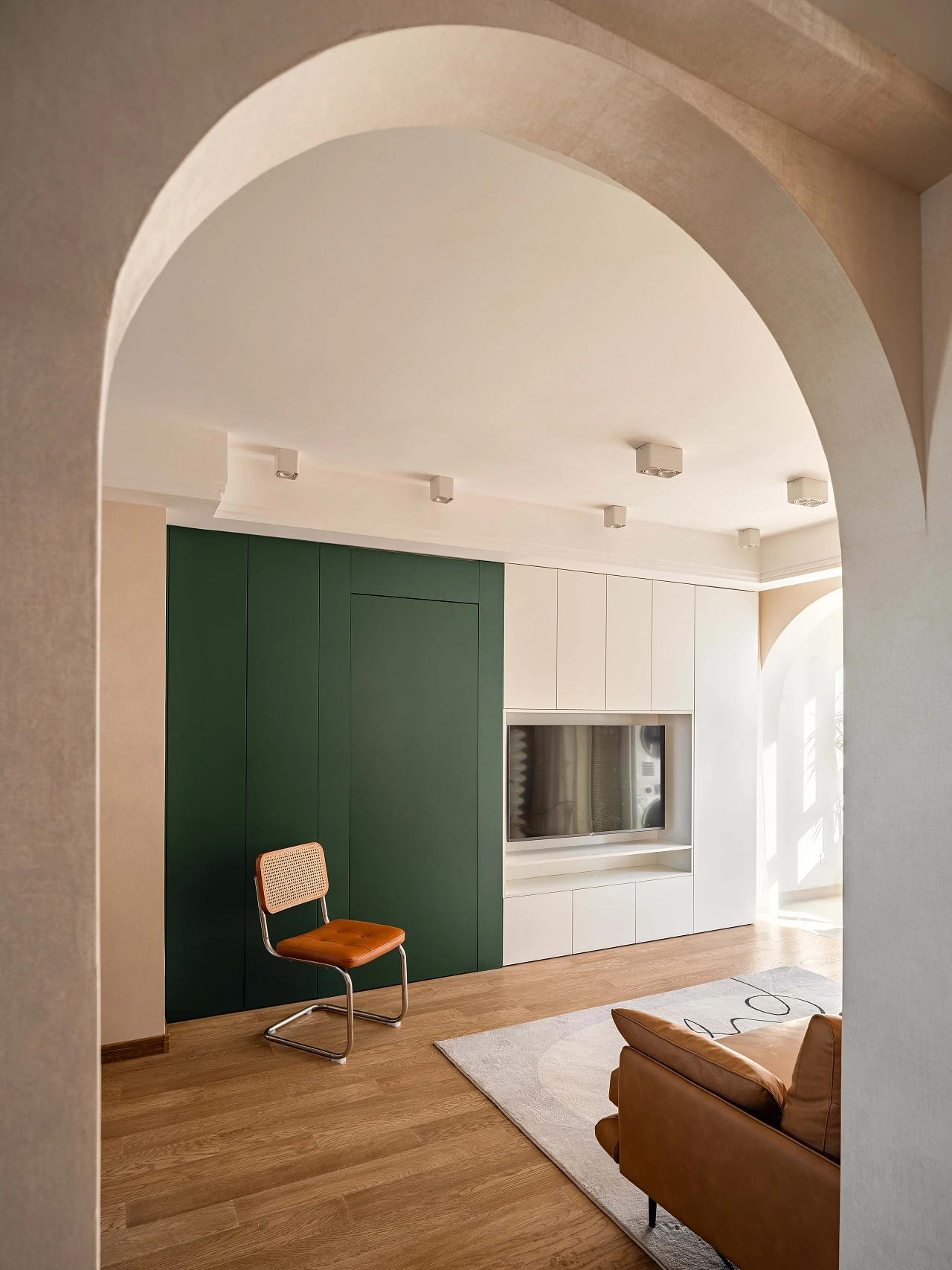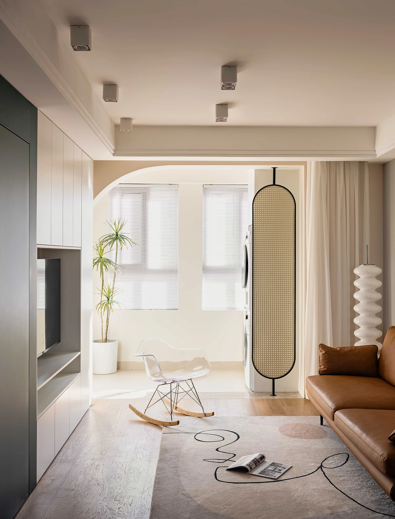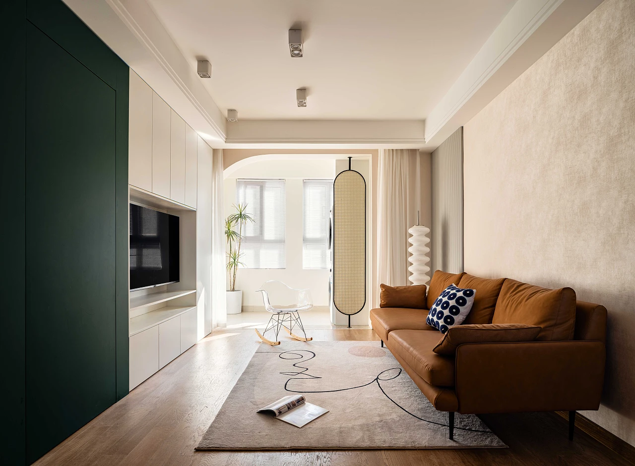 低饱和的温暖配色搭配多处雕琢的细节,营造出别致又俏皮的家居氛围。