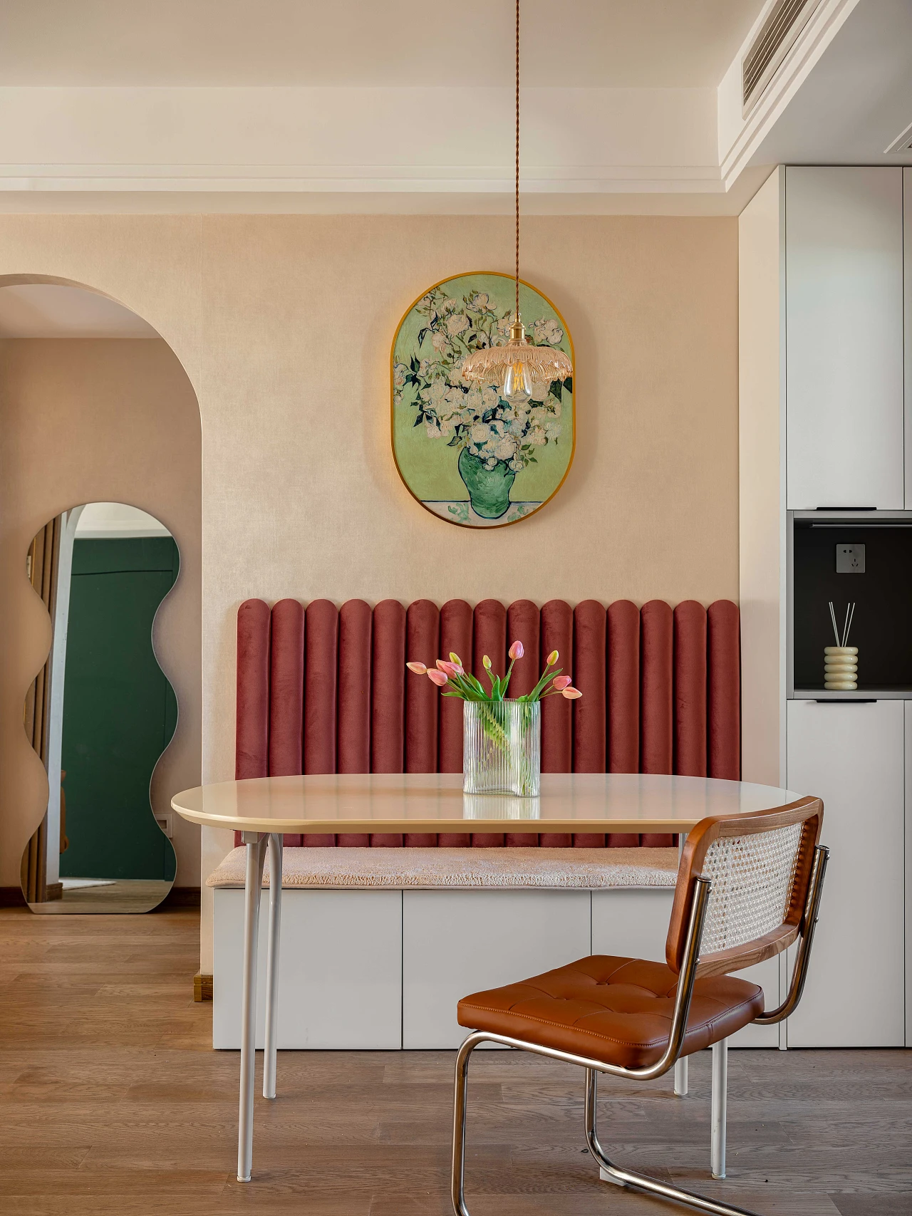 考虑到餐厅区域面积不大,设计团队采用精致小巧的卡座形式,既优化了生活动线、增加了收纳空间,又营造了别致的复古氛围感。