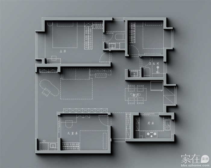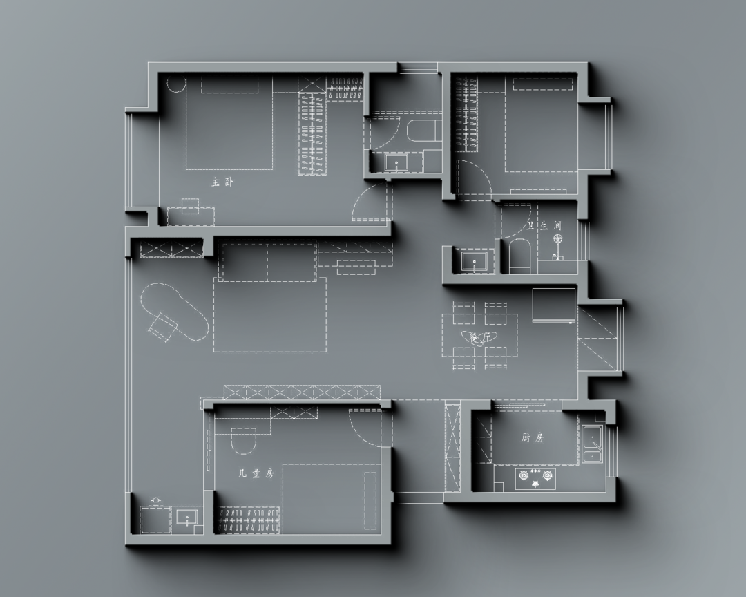 儿童房布置在朝南小房间,与学习娱乐区较近且从阳台处贯通,客厅的阅读娱乐区和儿童房的学习休息区动静结合组成了孩子生活区中心所在。