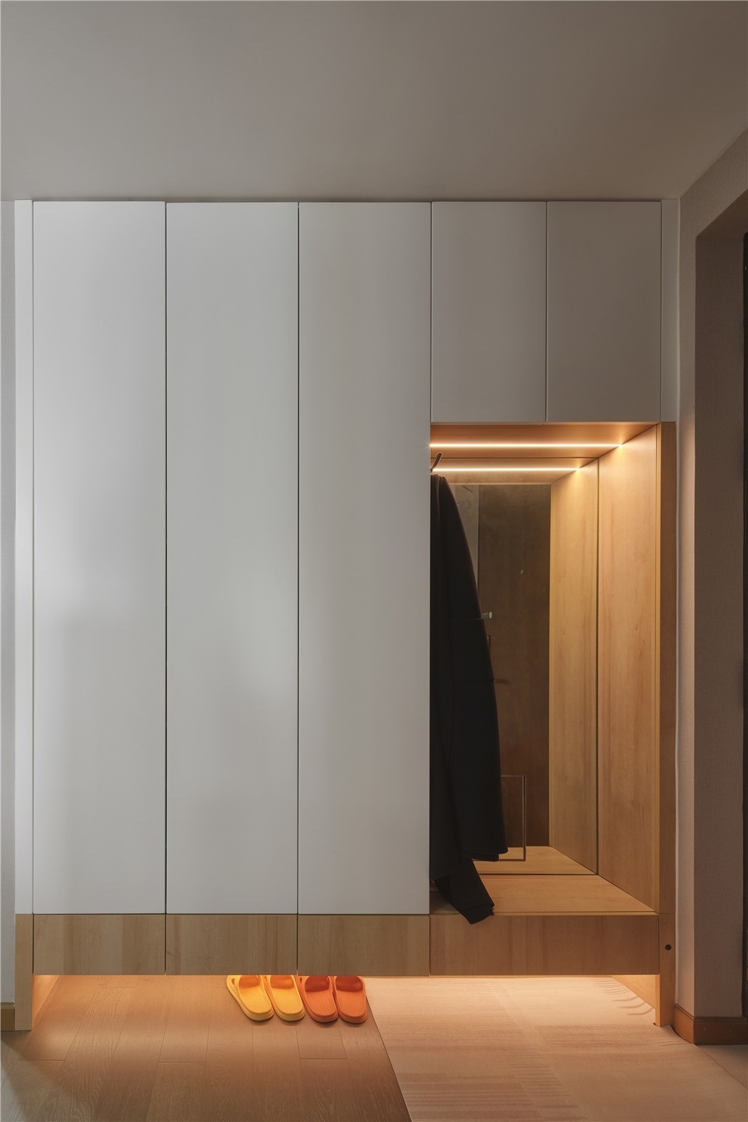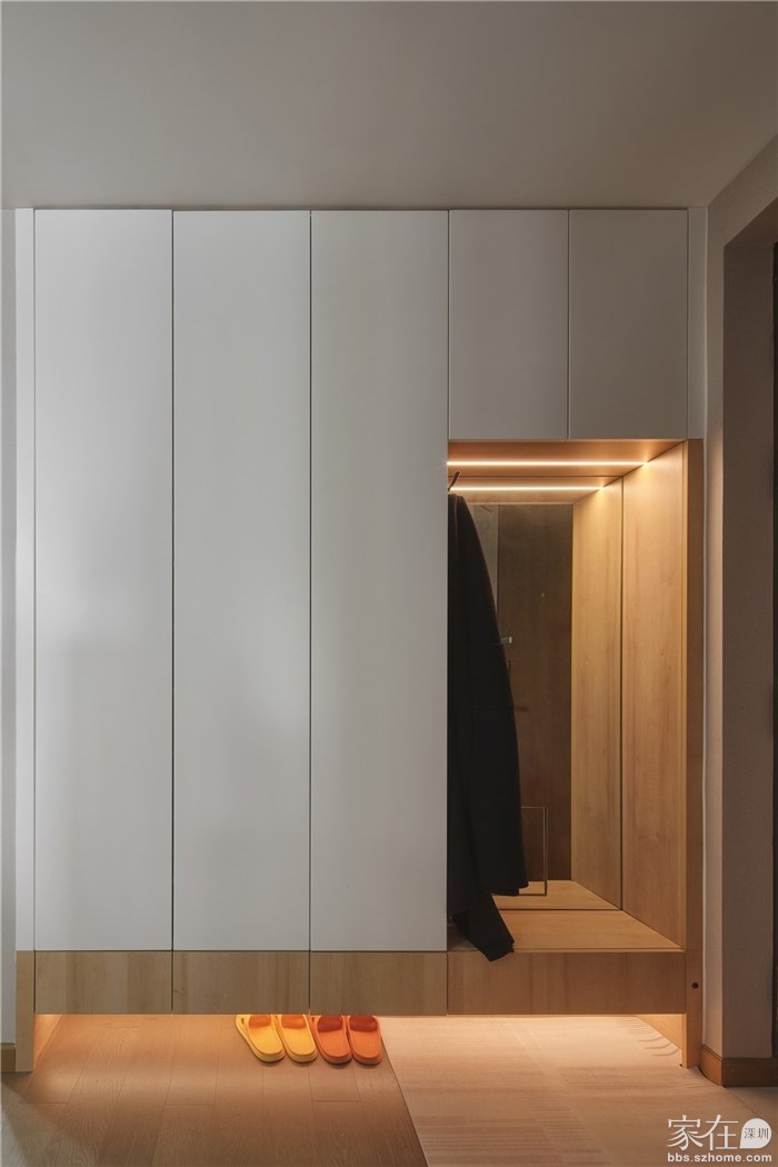 入户门进门处墙边做了实用的鞋柜收纳空间,在这里我们增加了坐着换鞋的位置,方便业主进出门换鞋,背景使用镜子方便业主出门整理衣帽,是个非常实用的小设计。