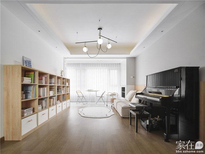 客厅压缩了该有的会客空间,与阳台打通后,整个客厅空间宽敞通透起来,给孩子人安排了书架墙和钢琴,为了不影响客厅的活动空间,把休闲阅读区安排到了阳台,不临街的高层阳台还是很安静的,采光确实非常的好,所以半遮光的纱帘对于白天在此阅读还是很有必要的。