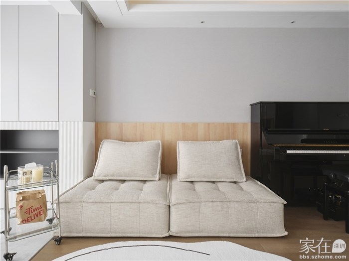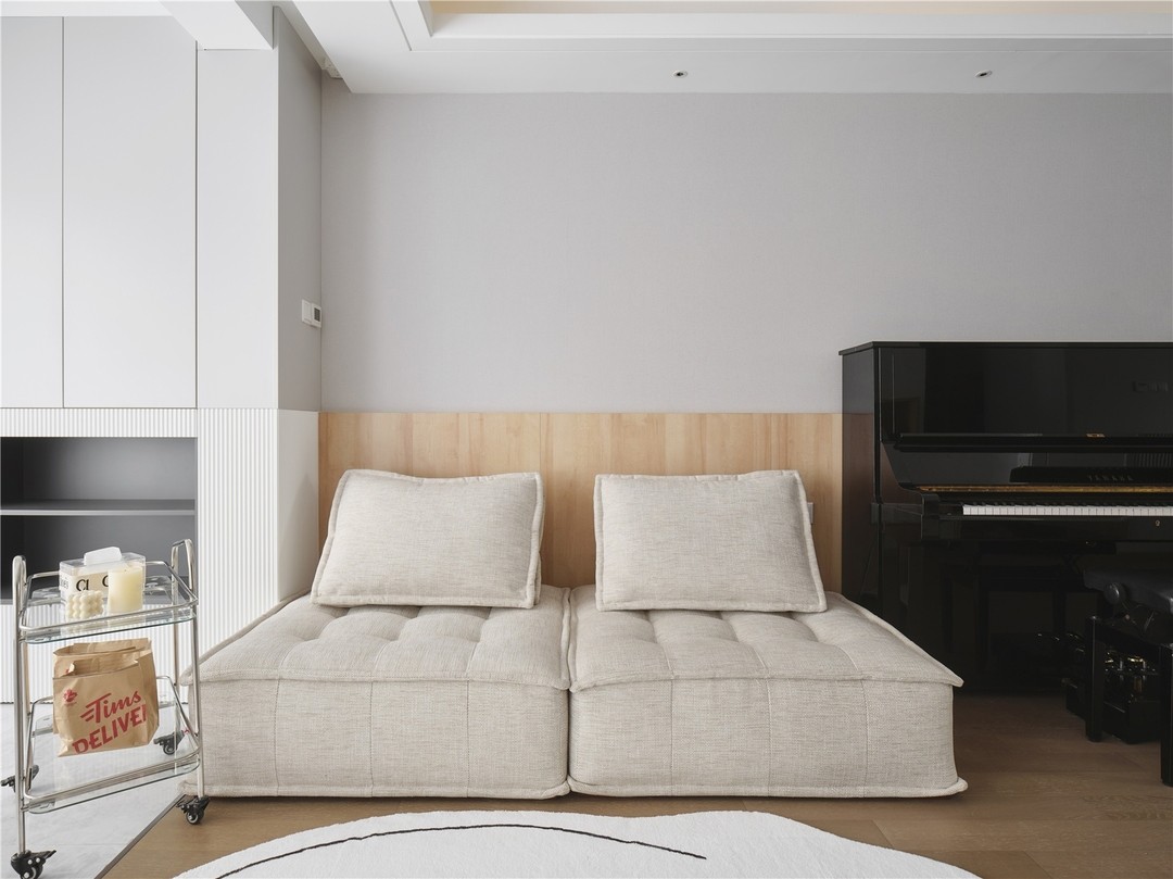 取消了电视,大沙发就不那么必要了,留了个双人模块沙发的位置,自由组合很方便,沙发边放置钢琴,为孩子打造带有艺术氛围的客厅,让孩子在客厅里有学习和弹钢琴的欲望。