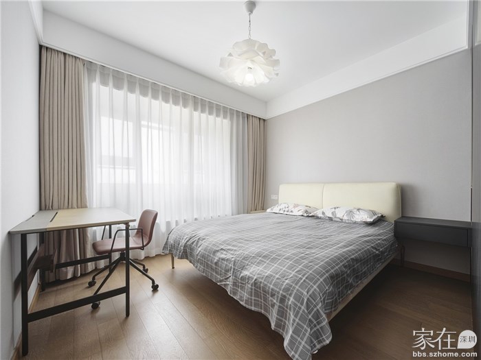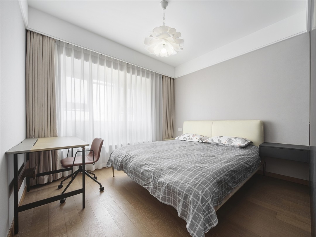 主卧整体非常的简洁素雅,简易的书桌椅放在床位就是业主的办公空间。主卧床和卫生间之间,设立了一个大衣柜,使用这个衣柜分隔出一个半开放的衣帽空间,把主卫囊括在内,增加些私密性。