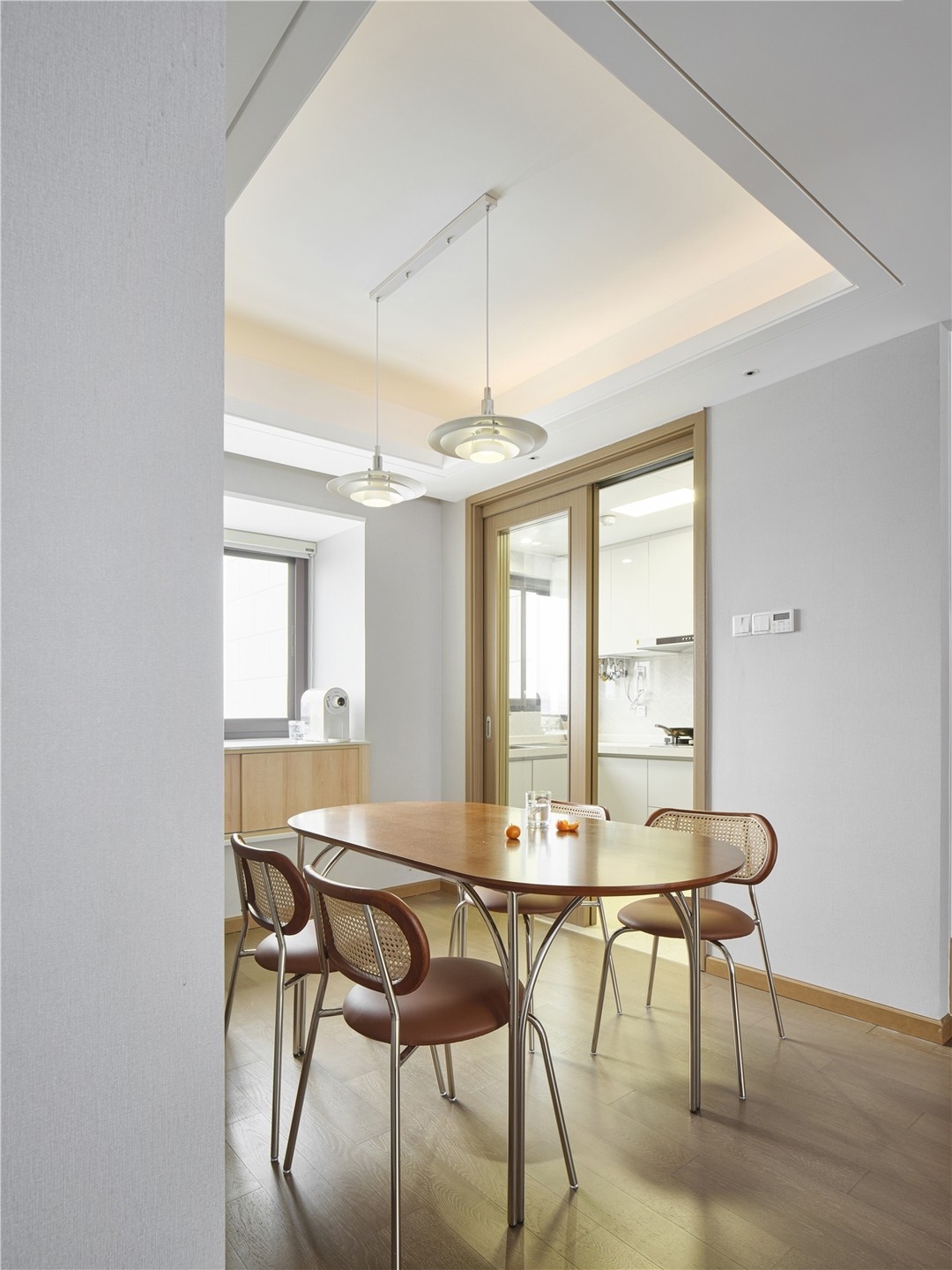 精装修的地板和厨房移门都没有更换,餐厅空间本身较小,所以在餐厅布置了简单的餐桌餐椅,简约清爽。