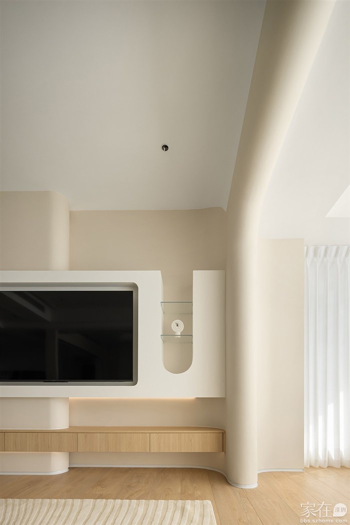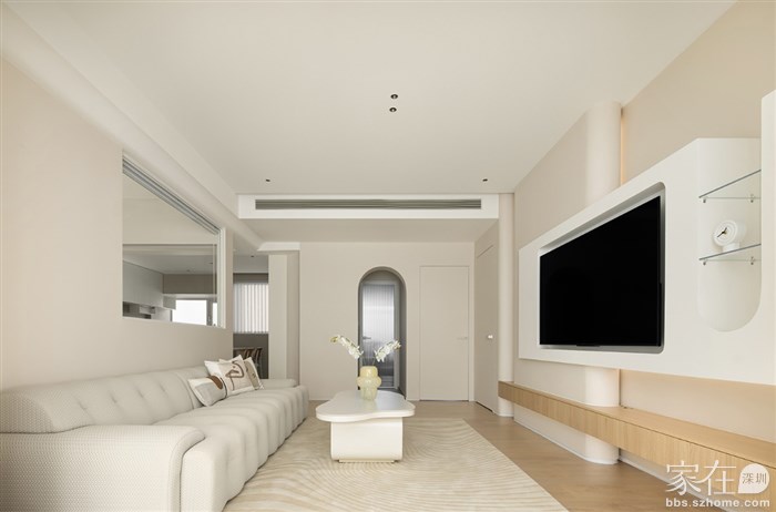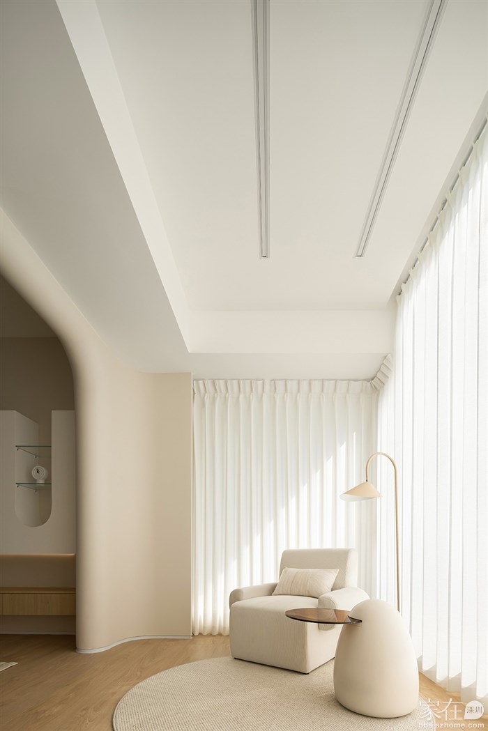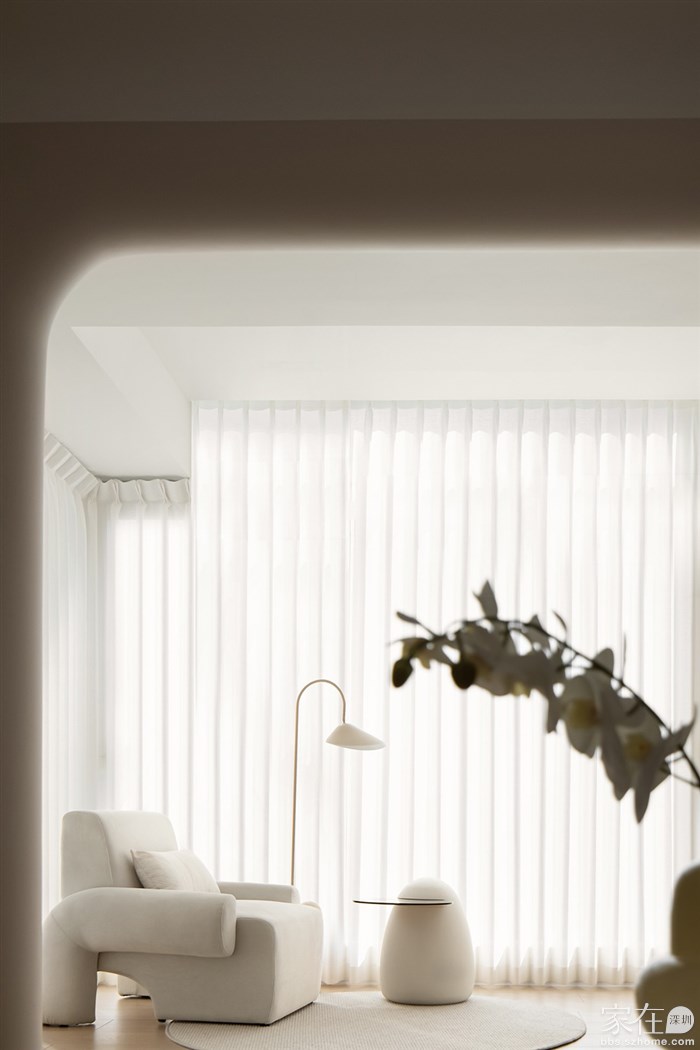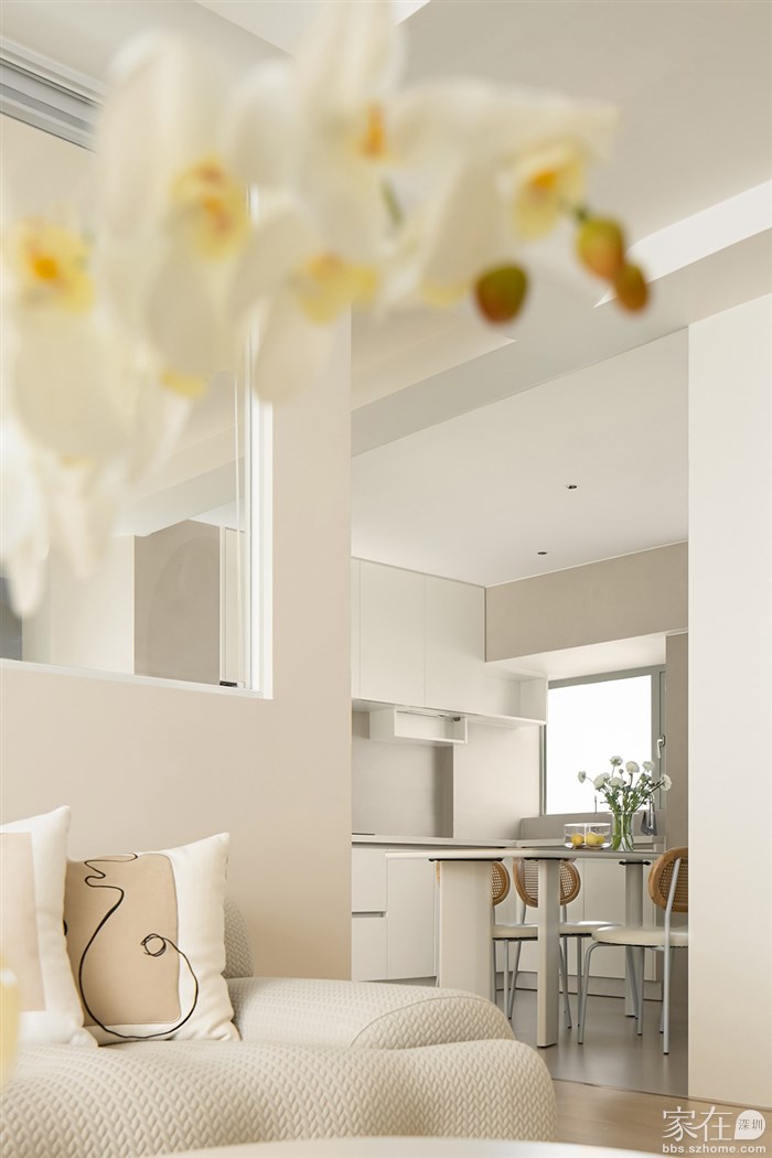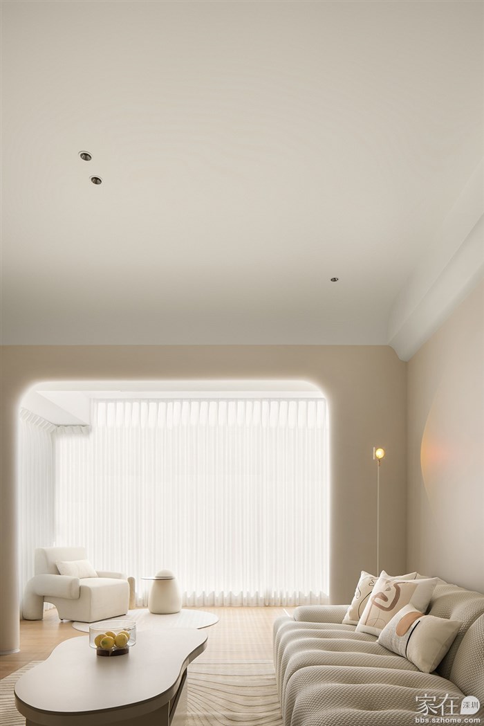 通过了解客户的品味和喜好,我们打通了客厅与阳台、餐厅与厨房,视觉上更觉通透敞亮,整体空间都以清浅温柔的奶油色调装饰,同时结合房屋原有架构,在处理梁和门洞时,我们使用了比较多的弧形来收口,给人一种流畅、柔和的感觉,能够缓解室内空间的硬朗感,增加室内空间的温馨感。