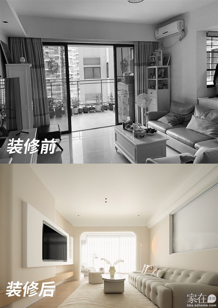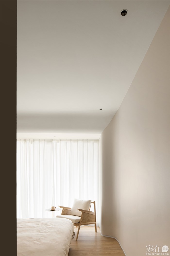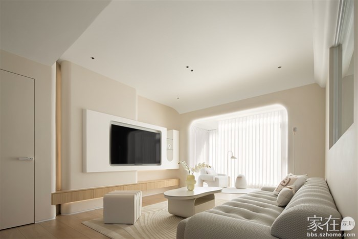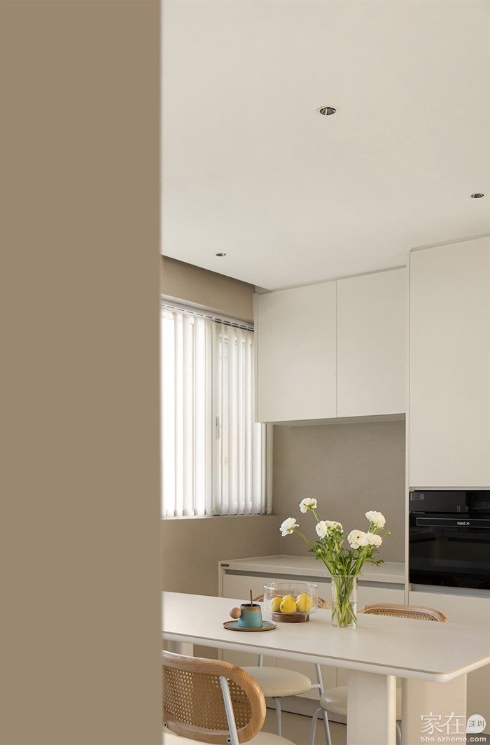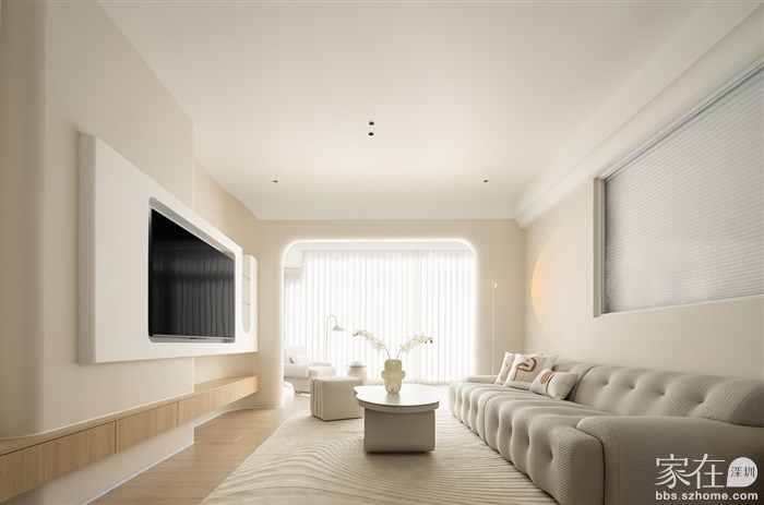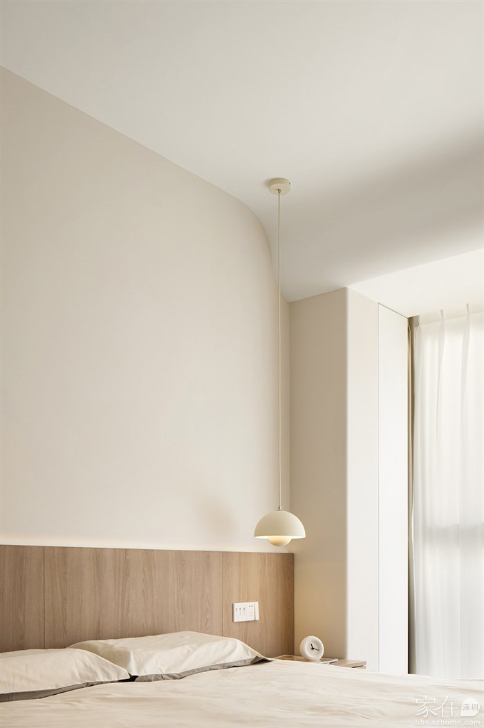通过了解客户的品味和喜好,我们打通了客厅与阳台、餐厅与厨房,视觉上更觉通透敞亮,整体空间都以清浅温柔的奶油色调装饰,同时结合房屋原有架构,在处理梁和门洞时,我们使用了比较多的弧形来收口,给人一种流畅、柔和的感觉,能够缓解室内空间的硬朗感,增加室内空间的温馨感。