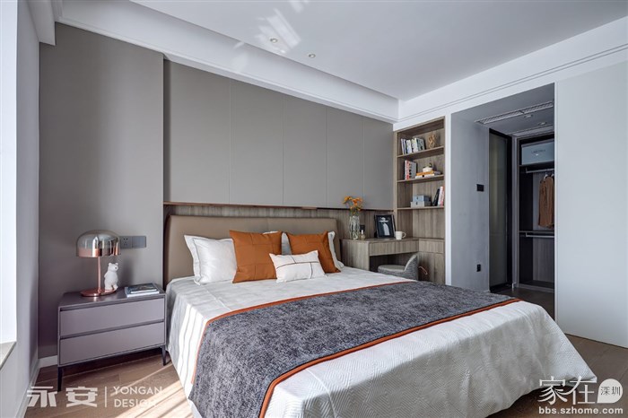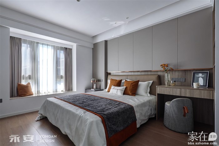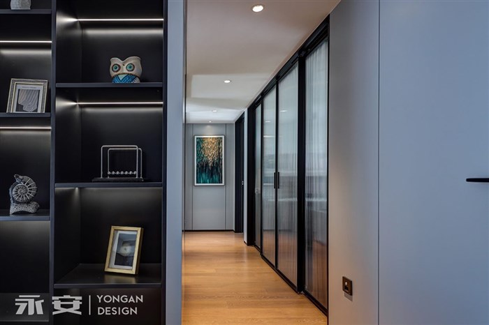 过道内的色彩与材质是公共区域的延续,浅灰色的柜门及房门格调一致、浑然天成,走道尽头的装饰画与空间关系协调对应,以实用性为目的的设计,同样兼顾美的存在。