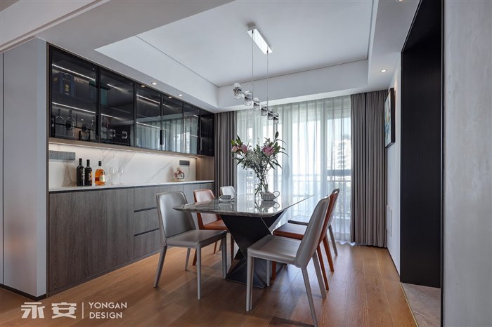 餐厅的餐边酒柜半透明设计,光影之间在映衬着,柜中间一字横隔断的餐边大理石桌板,和电视柜材质呼应,内嵌的线形灯,让人感觉简洁实用,又不乏对细节的用心思考。