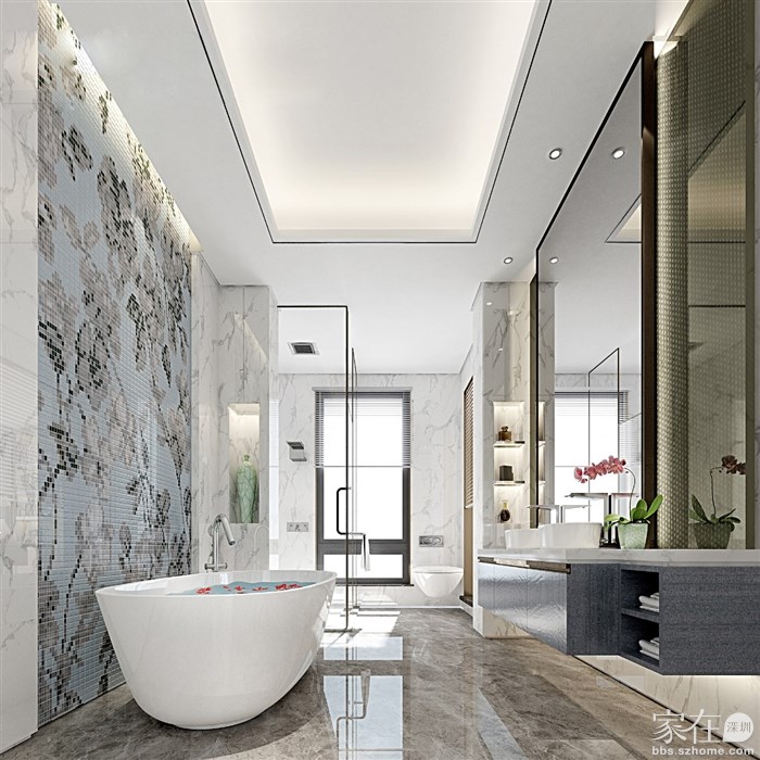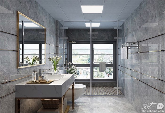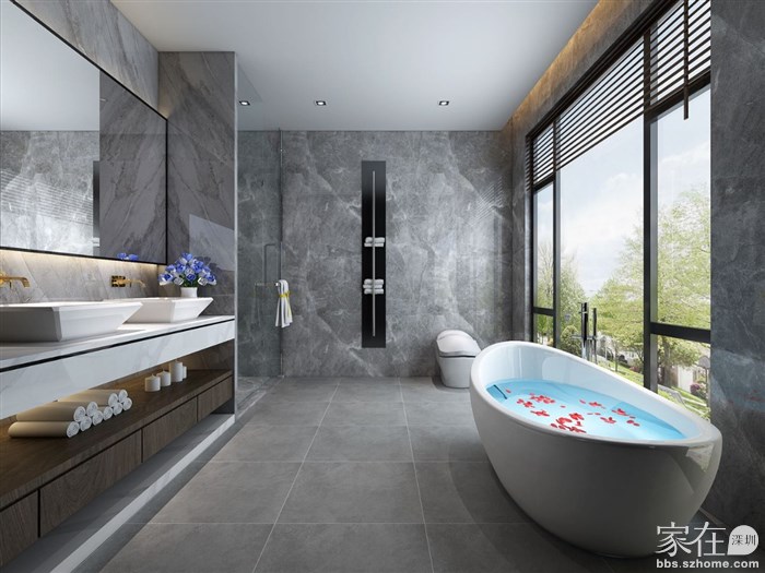 现在流行的做法是:去除厚重的移门和挡水条,淋浴区适当做下沉,中间做大理石拉槽板,四周留十公分排水沟,淋浴区内侧留坡度,方便排水更快。地面与墙面挖槽暗藏磁吸轨道,安装极窄的玻璃门,这样装美观又实用。