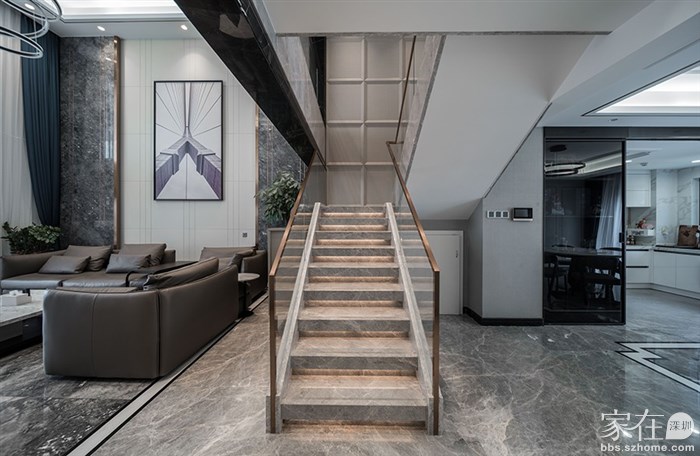 楼梯踏步建议选用石材的,首先是石材颜值高、款式多,打理卫生非常方便,相对于木质踏步来说更耐用,而且石材方便做倒角、磨边细节处理,这是瓷砖、岩板和木质的材质代替不了的。楼梯踏步石材的颜色,尽量选择浅色,可以选择带一点点淡淡纹理的白色系、浅灰色系。