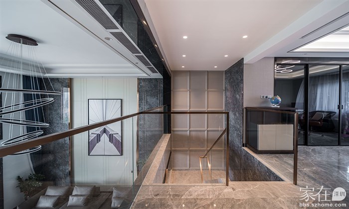 玻璃打光需要内嵌灯带,一段楼梯用一整条灯带,基本上选择了超白玻璃做出来的效果就很漂亮。如果层高允许,再搭配一盏艺术感的中空吊顶,整个楼梯颜值就绝了。