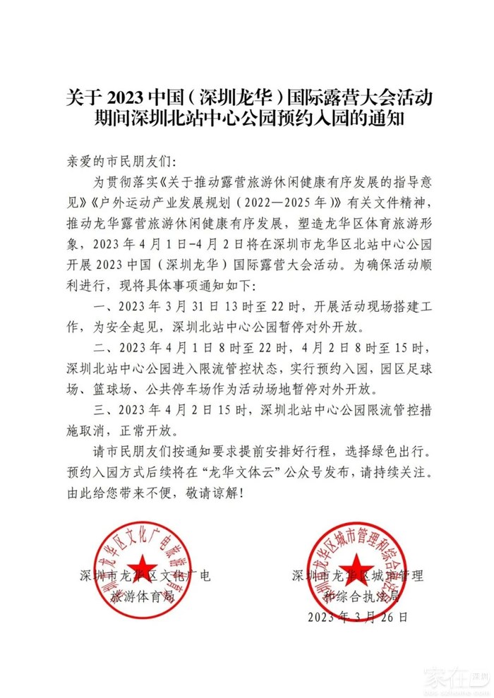 为贯彻落实《关于推动露营旅游休闲健康有序发展的指导意见》《户外运动产业发展规划(2022—2025年)》有关文件精神,推动龙华露营旅游休闲健康有序发展,塑造龙华区体育旅游形象,2023年4月1日-4月2日将在深圳市龙华区北站中心公园开展2023中国(深圳龙华)国际露营大会活动。为确保活动顺利进行,现将具体事项通知如下: