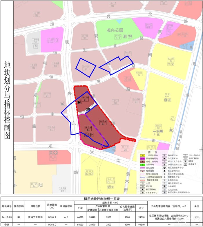 将14-17地块(普通工业用地)拆分为14-17-03地块、14-17-04地块和14-17-05地块。调整后14-17-03地块用地面积14356.2平方米,用地功能保持不变,容积率调整为6.6;14-17-04地块用地面积19151.7平方米,14-17-05地块用地面积9877.5平方米,用地功能及容积率均保持不变。