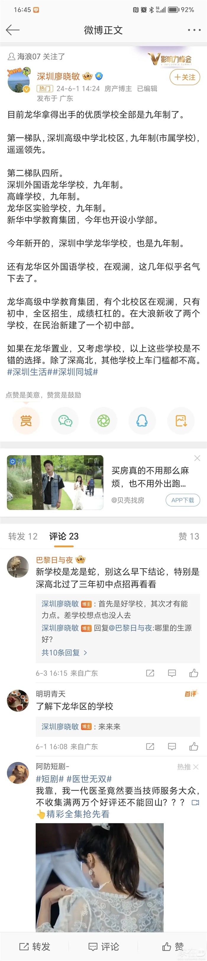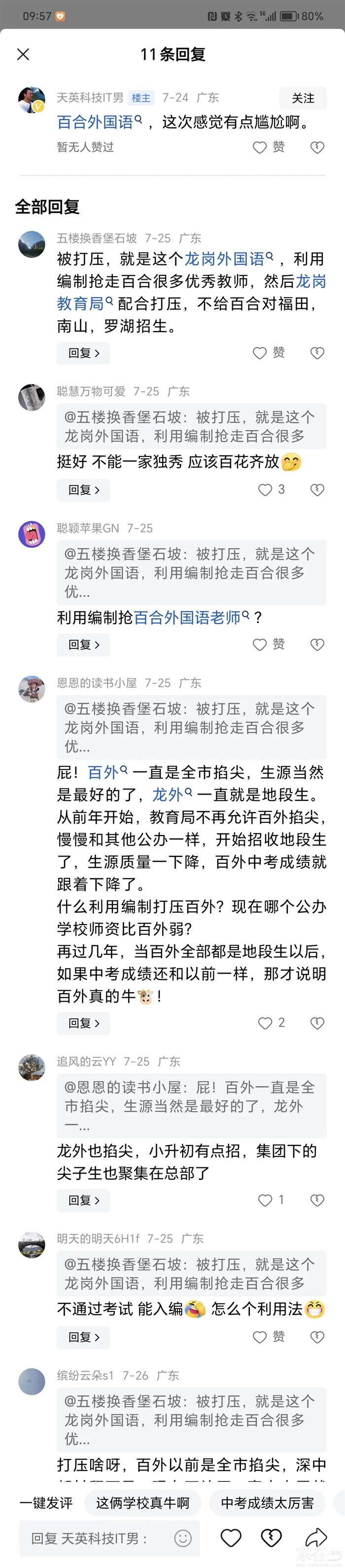 24年肯定比23年还要好引用24楼alexhy的发言:龙外是不是靠几个尖子生宣传了?总体实力不堪入目吧?引用楼主的发言:今年中考成绩龙华前两名,好像没有深高北深外龙华什么事这两所学校本质就是普通学校,有远见的家长怎么可能让自己孩子保送上大学读小语种?