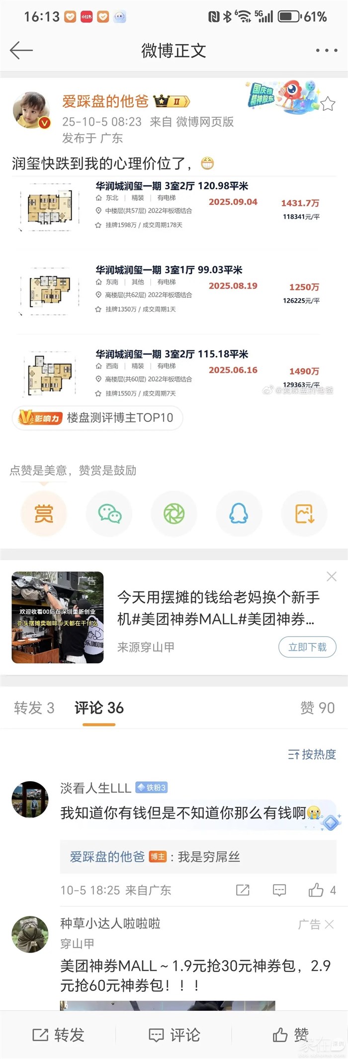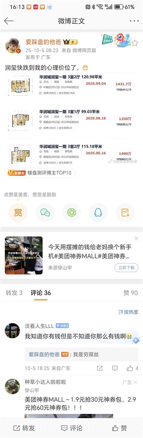 引用我是钟叔叔好朋友的发言:确实不错,价格降到2015年了引用alexhy的发言:星河盛世 9 月成交量还可以。引用我是钟叔叔好朋友的发言:引用alexhy的发言:水榭春天 5 期 660W 都有成交的,这个应该是赠送面积比较大,否则没有这个价格。引用我是钟叔叔好朋友的发言:信了?你该不会信了吧?引用alexhy的发言:水榭春天 5 期 89 可以做四房,赠送面积看来不小,怎么价格同玖龙玺差不多了?引用我是钟叔叔好朋友的发言:人家通过给星河盛世当带头大哥,不允许星河盛世涨价,也做出了牺牲啊引用alexhy的发言:龙华大 V也是厉害,通过吹捧深高北和龙华实验学校,靠收咨询费买了四套房还有一辆宝马车,据说存款还有不少,韭菜被人割了!还要帮着数钱。引用我是钟叔叔好朋友的发言:深外龙都能号称深圳顶级名校,top3就好像也没那么过分啊引用alexhy的发言:深高北宣传全市 TOP3,不进去读书试下,听自媒体宣传不就容易当韭菜吗?引用我是钟叔叔好朋友的发言:你非得吃屎才才能确认屎是不能吃的吗?引用alexhy的发言:过来住一下,看下是不是吵。深高北和龙华实验学校搞假成绩被扒光了吧?引用我是钟叔叔好朋友的发言:夹着几个主干道,谁住谁知道引用alexhy的发言:这好像没啥啊。引用我是钟叔叔好朋友的发言:听听业主怎么说的,星河盛世真热闹啊!引用alexhy的发言:这个不报希望,但是二手房业主绝对没人说亏惨了。引用我是钟叔叔好朋友的发言:星河盛世上限就不得了了
