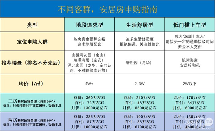 1、资金充裕,追求地段,考虑南山、宝安4W+的安居房