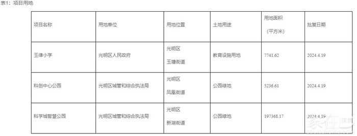玉律小学、科创中心公园、科学城智慧公园共3个建设项目用地已获光明区人民政府批复(具体内容见下表,具体位置见附件),现按规定予以公布: