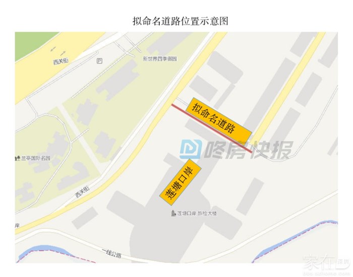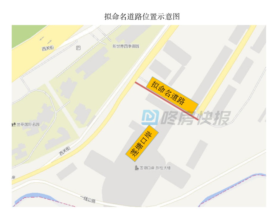 拟命名道路位于莲塘口岸东侧,为口岸二层平台外围通道,长约130米,宽约12米,拟命名方案为“莲强路”。
