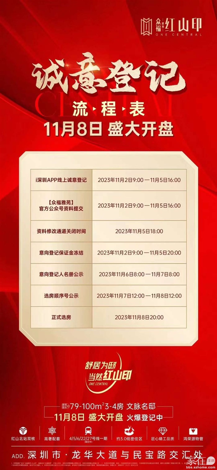 龙华红山[众福·红山印]已拿证即将i深圳登记,推183 套住宅,建面约79-100m的3-4房,备案均价约7.87万/m,备案单价约 7.47-8.43万/m,备案总价约596-850万/套,开盘2个99折,简装交付。