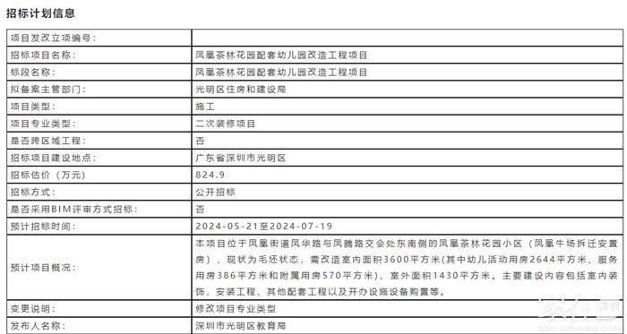 预计项目概况: 本项目位于凤凰街道凤华路与凤腾路交会处东南侧的凤凰茶林花园小区(凤凰牛场拆迁安置房),现状为毛坯状态,需改造室内面积3600平方米(其中幼儿活动用房2644平方米、服务用房386平方米和附属用房570平方米)、室外面积1430平方米。主要建设内容包括室内装饰,安装工程、其他配套工程以及开办设施设备购置等。