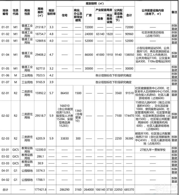 项目更新单元用地面积243751.1平方米,拆除范围用地面积221870.7平方米,开发建设用地面积143545平方米(含划入零星用地478.7平方米),规划容积685370平方米,其中住宅286290平方米(含租赁型人才住房15284平方米、公共租赁住房15283平方米、安居型商品房15283平方米),商业、办公及旅馆业建筑3160平方米(含母婴室10平方米),厂房264000平方米,产业配套用房109870平方米(含宿舍106140平方米,商业服务设施3730平方米),公共配套设施(含地下)22050平方米(含15班幼儿园4500平方米、占地面积4500平方米,社区管理用房300平方米,便民服务站600平方米,社区警务室100平方米,文化活动室1000平方米,社区健康服务中心2000平方米,社区老年人日间照料中心1500平方米,邮政所100平方米,小型垃圾转运站500平方米,公共厕所120平方米,再生资源回收站300平方米,环卫工人作息房20平方米,110KV变电站2800平方米,公交首末站4300平方米,公共充电站1100平方米,综合接入机房60平方米,社区级公共配套用房2750平方米<含社区党群服务中心650平方米,托育服务机构600平方米>)。另配建社区体育活动场地2处占地3000平方米,社区儿童游戏场地3处占地1500平方米。