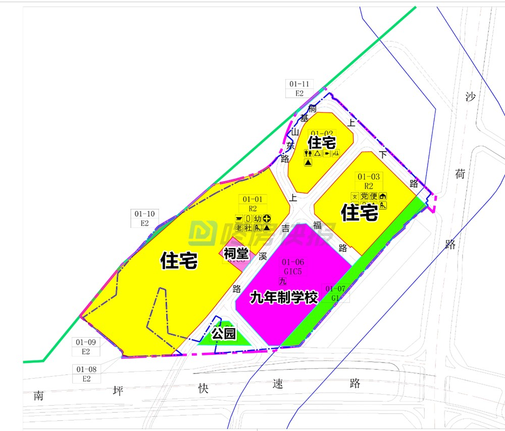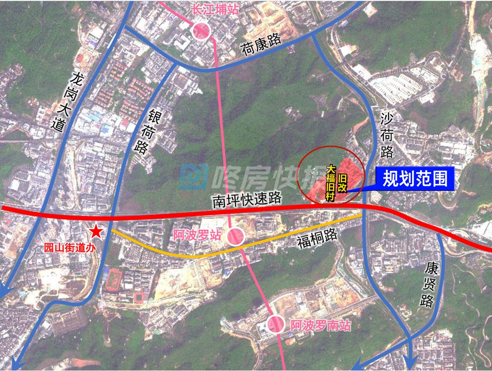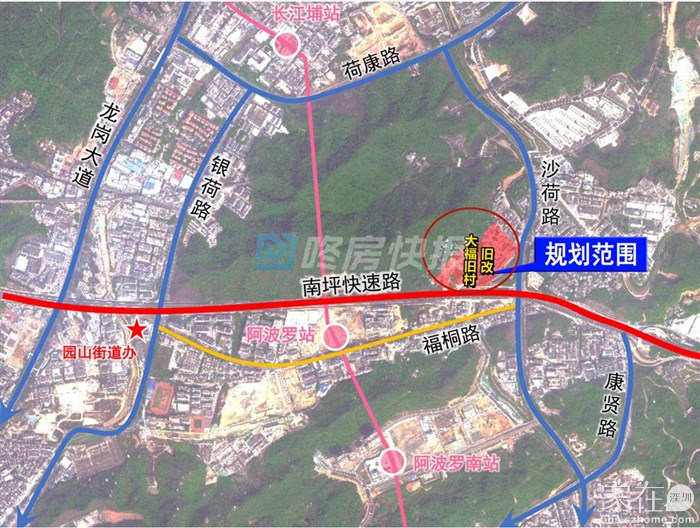 龙岗区园山街道大福旧村城市更新单元一期位于南坪快速路与沙荷路交会处西北侧。