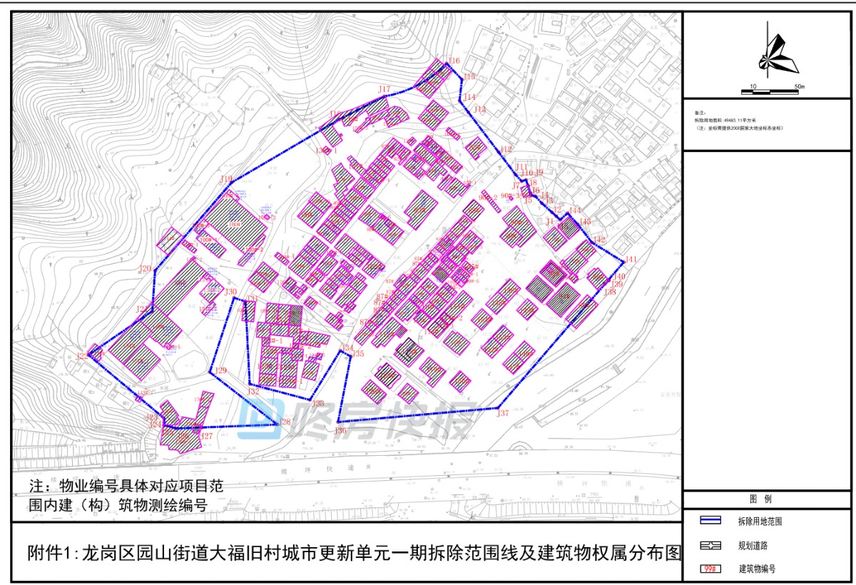 该更新单元一期规划拆除用地面积为49483.1平方米。深圳市卓弘大福房地产开发有限公司已完成该更新单元一期规划拆除用地范围内土地、房屋及其它地上附着物的搬迁补偿安置协议的签订,并申请确认为该范围的实施主体。