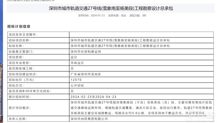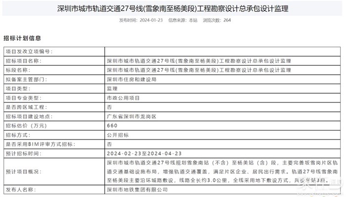 深圳市城市轨道交通19号线一期、25号线一期、27号线一期、29号线一期、32号线一期、西丽综合交通枢纽工程燃气监理项目公告
