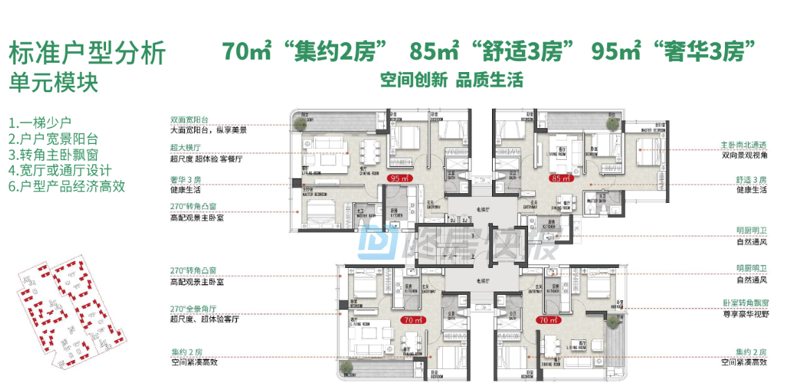 面积段为70-85-95平米两至三房