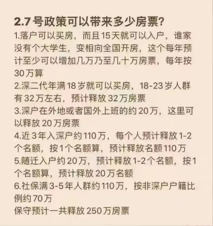引用楼主的发言:深圳2.7楼市限购新政预计释放250万张房票,其中包括了以下几类人群:一、满18岁的深二代;二、单身离异不再倒追以往家庭套数;三、社保满3年非深户;四、人才引进的新深户