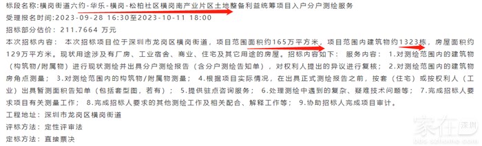 本次招标项目位于深圳市龙岗区横岗街道,项目范围面积约165万平方米,项目范围内建筑物约1323栋,房屋面积约129万平方米。现状用途涉及有厂房、工业宿舍、商业、住宅及其它用途的房屋。