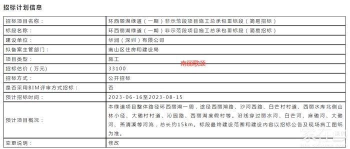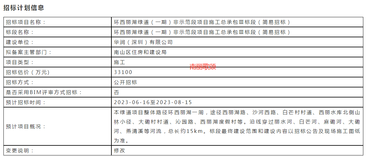 本绿道项目整体路径环西丽湖一周,途经沙河西路、西丽湖路、沁园路等市政道路,穿过丽水河、白芒河、麻磡河、大磡河、燕清溪等河流,总长约15km,其中本次竞赛范围的绿道长度约为12km,工程投资金额约12亿元 (不含示范段)。