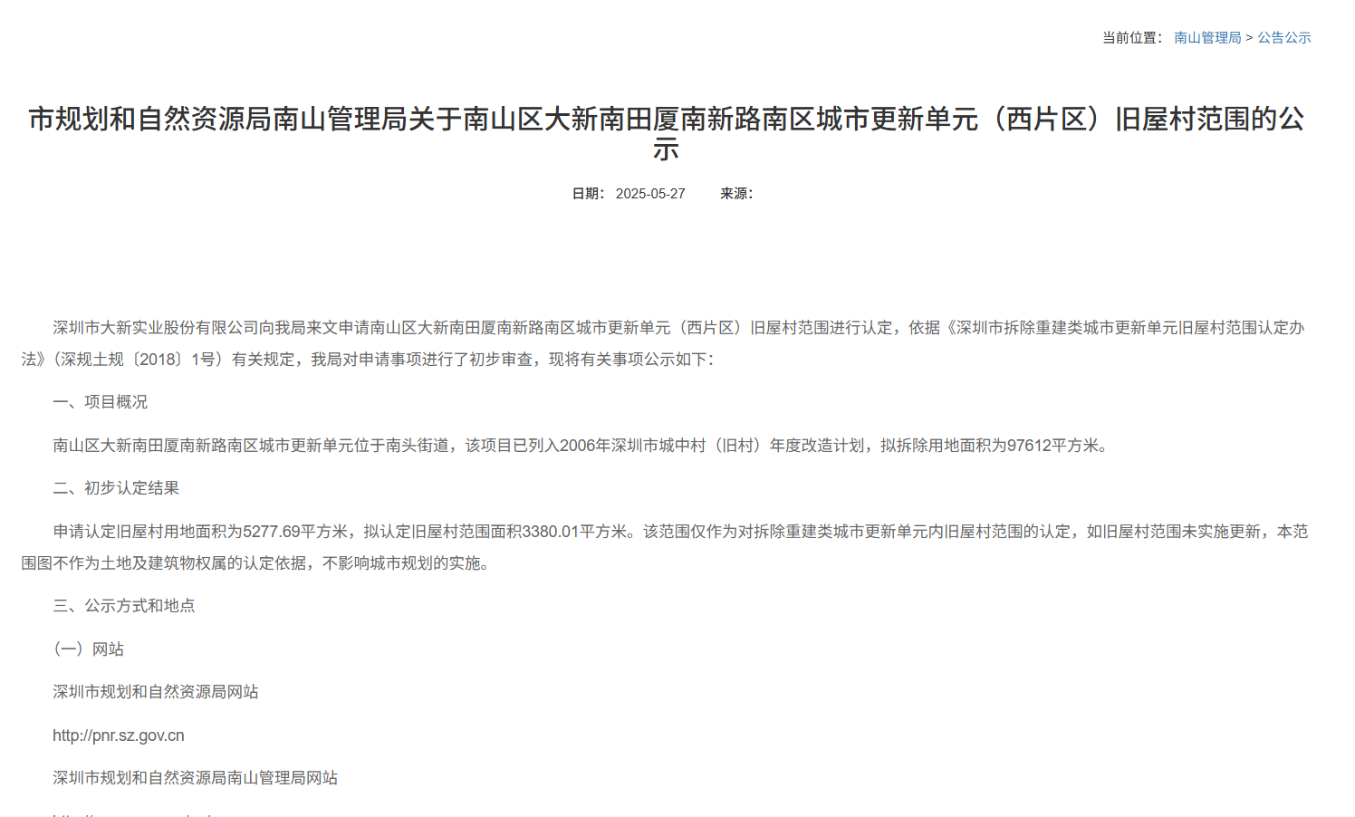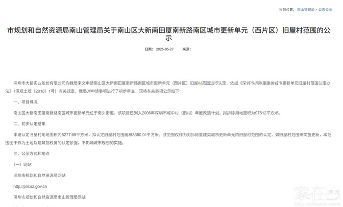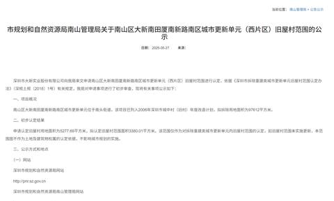 7月29日,南山区城市更新和土地整备局发布关于《南山区北头村改造地块专项规划修改》的公告。