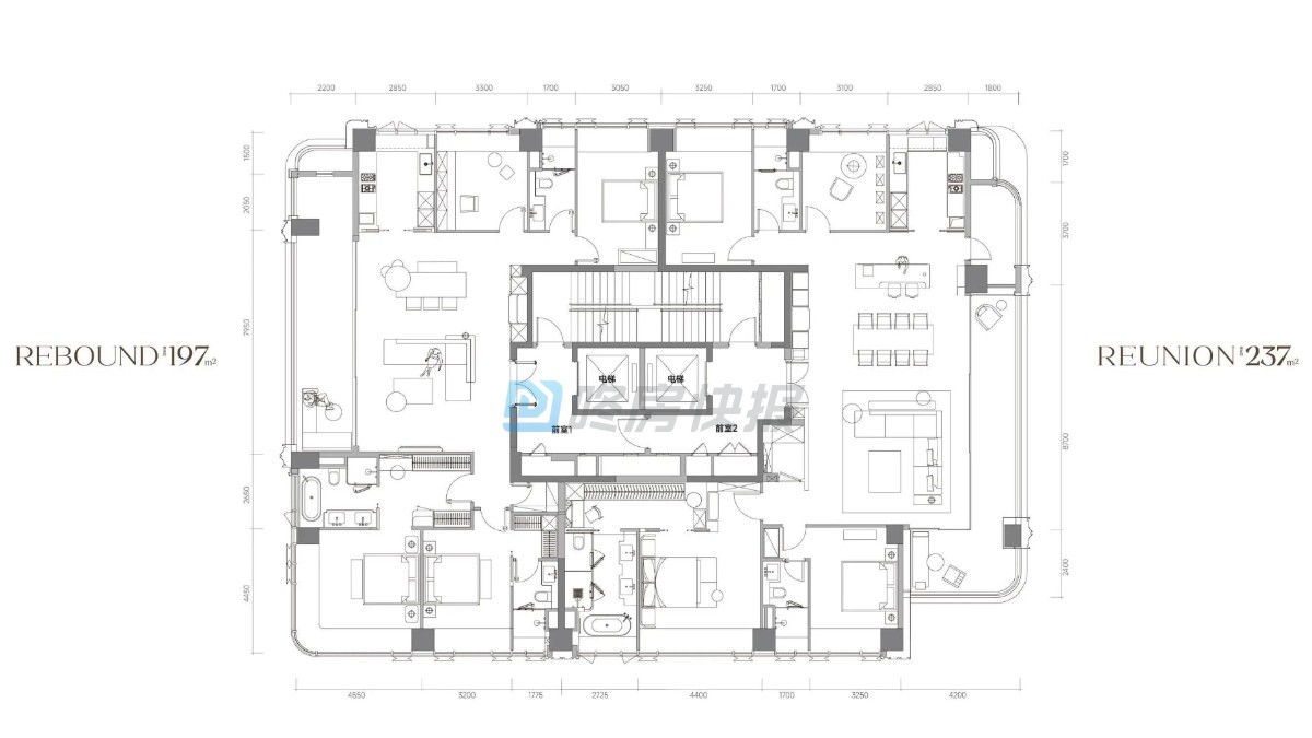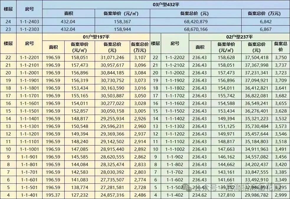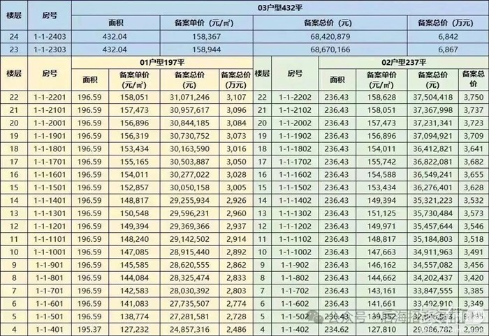 备案单价12.7-15.9万/㎡,总价2486-3750万。另有两套432㎡大平层,总价6842-6867万。