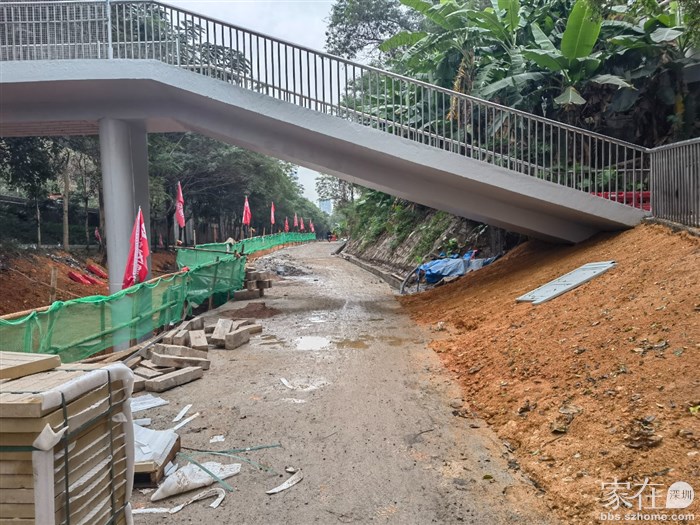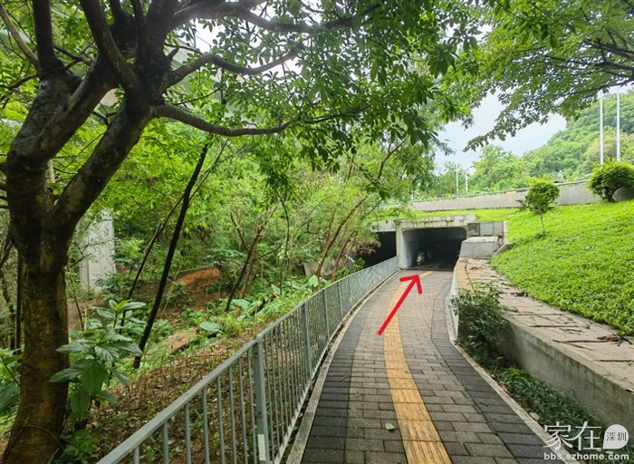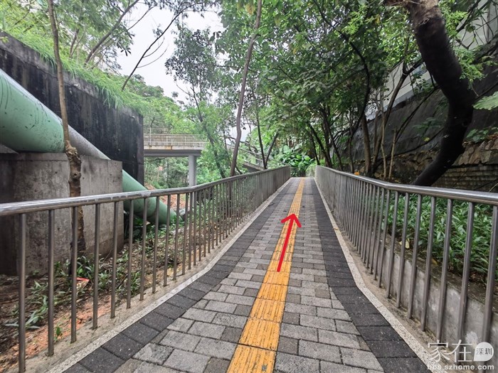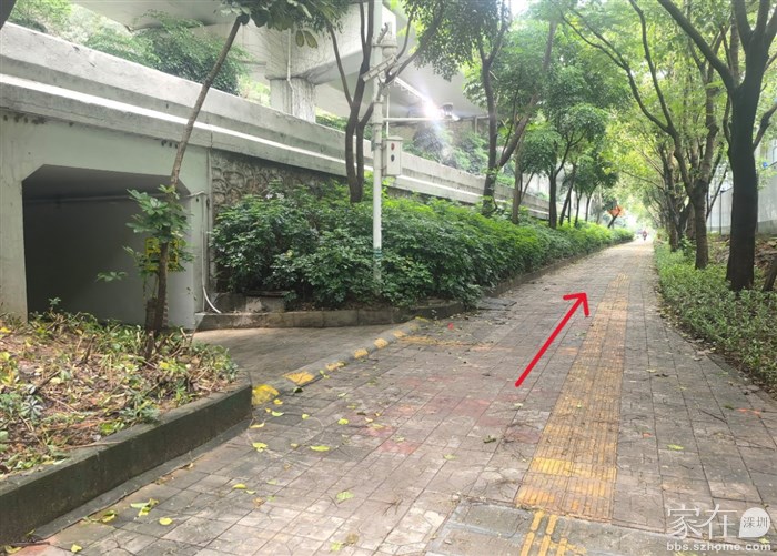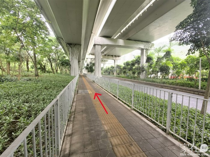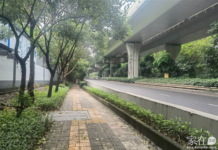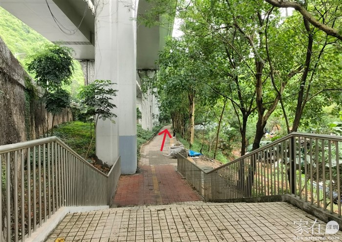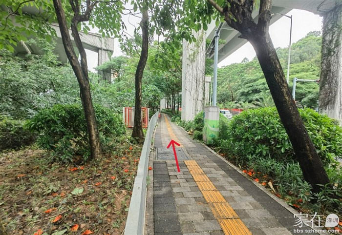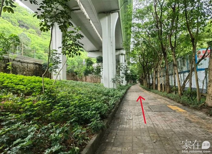 从兴海大道高架下沿山路旁边进入步行道,这一段是在高架桥下