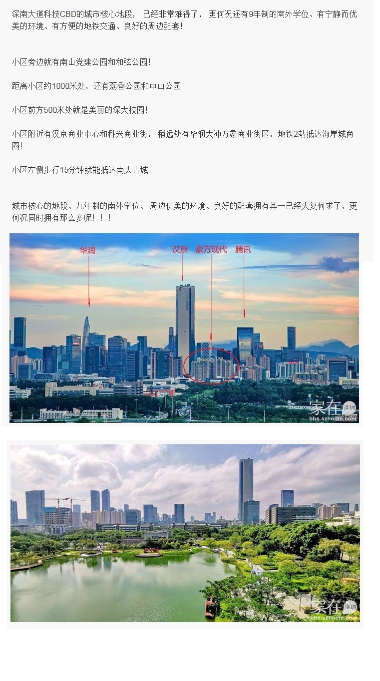 深南大道科技CBD的城市核心地段, 已经非常难得了, 更何况还有9年制的南外学位、有宁静而优美的环境、有方便的地铁交通、良好的周边配套!